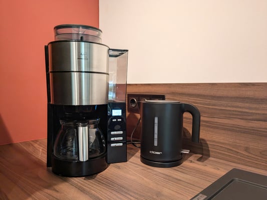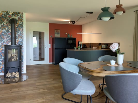 Es gibt eine Wohnküche mit Essecke und Sitzecke. Die Wohnung hat zwei Schlafzimmer, ein großes mit einem Doppelbett (180x200) und ein kleines mit zwei Einzelbetten (90x200).